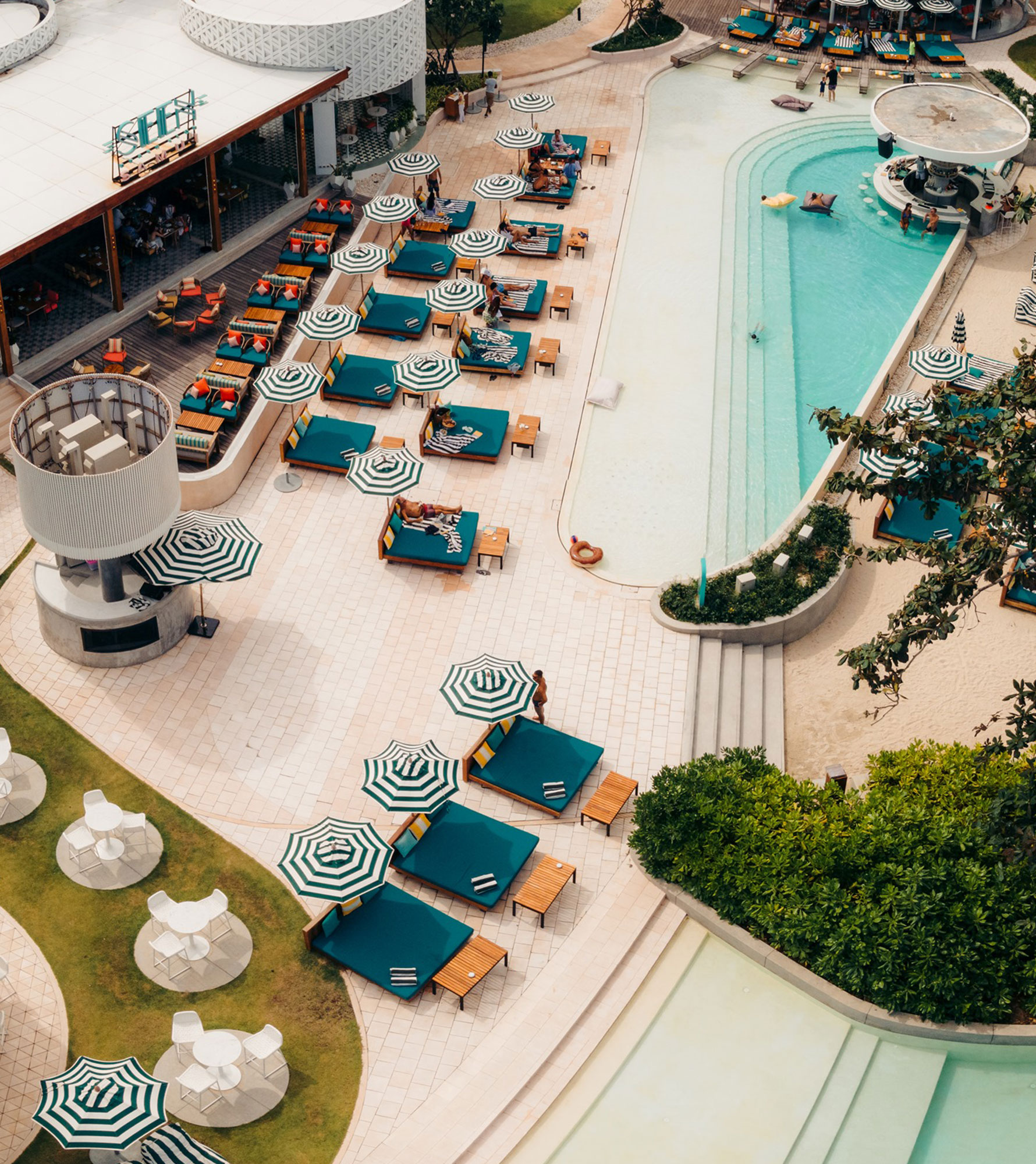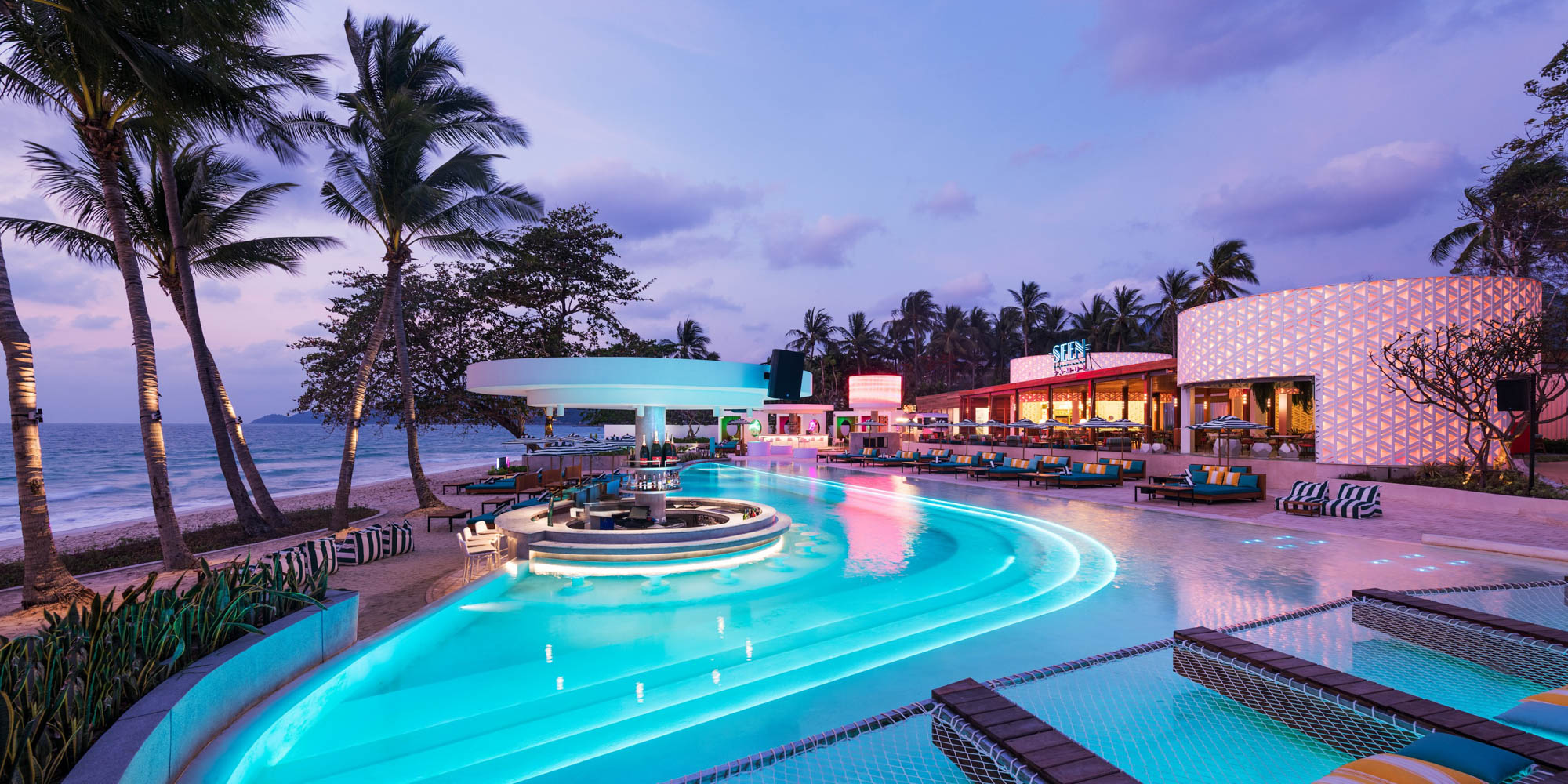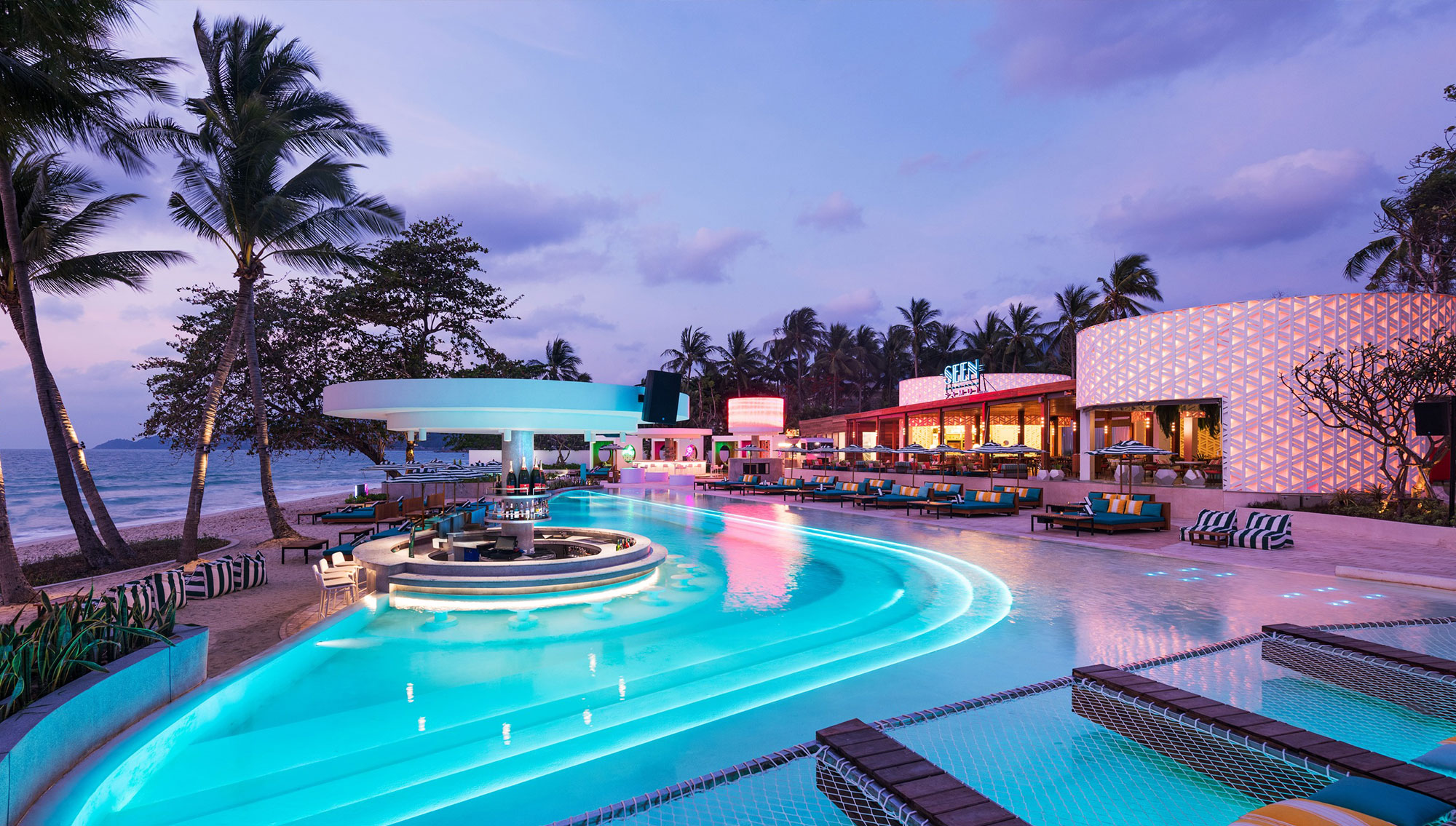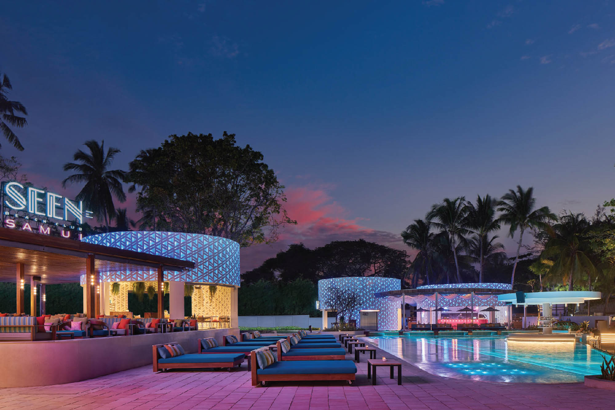 SEEN Beach Club Samui is a 3,000-square-meter retro-glam beachfront destination on Chaweng Beach. Inspired by a 1950s mid-century design, it blends tropical energy with bold design, two pools, three bars, and vibrant day-to-night experiences. Stylish, social, and full of rhythm—this is where Samui comes to play.